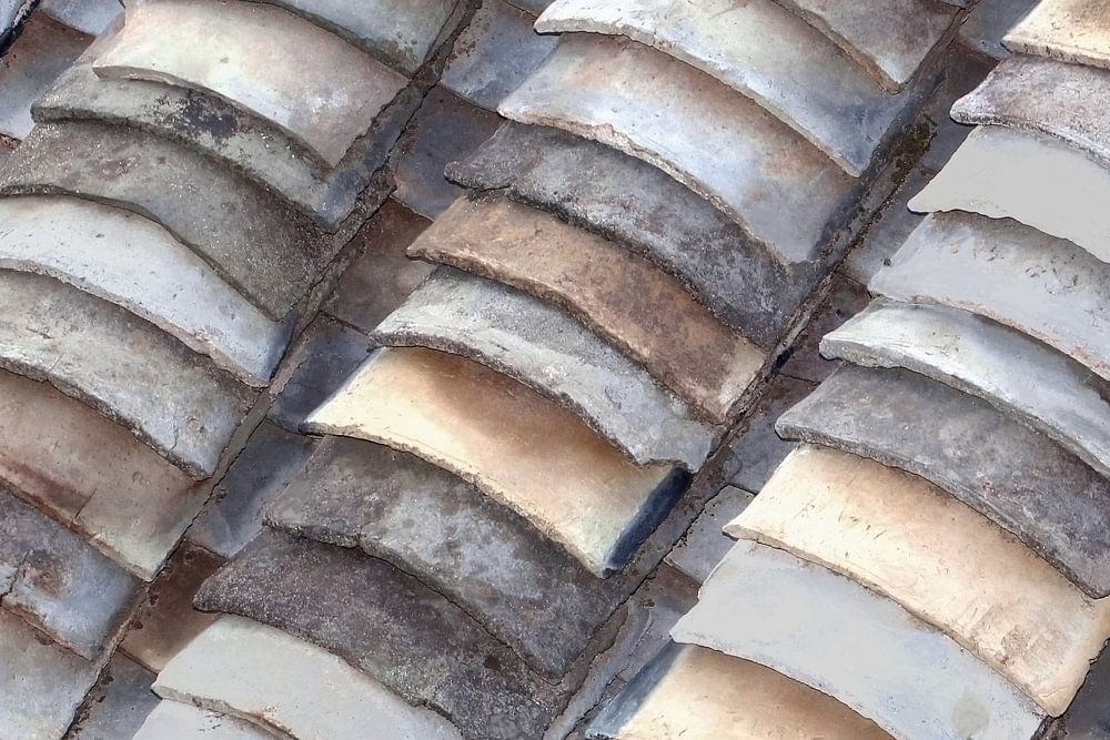 Des lignes, de vieilles tuiles en argile cuite (céramique) de couleur pastel douce, forment des lignes diagonales sur un toit chinois. Structures et motifs en pastel. Xingping, Yangshuo, Chine.