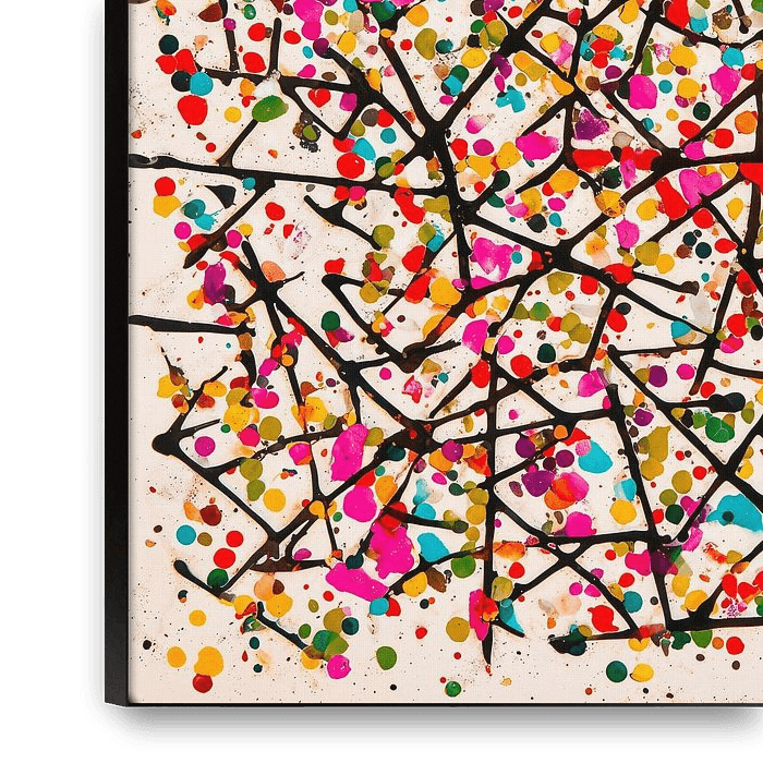 Une peinture expressionniste abstraite pleine de vie, caractérisée par un jeu dynamique de lignes chaotiques et de touches de couleurs vives, réparties de manière désordonnée sur toute la surface. La composition est énergique et spontanée, ce qui évoque une impression de mouvement et de vivacité.