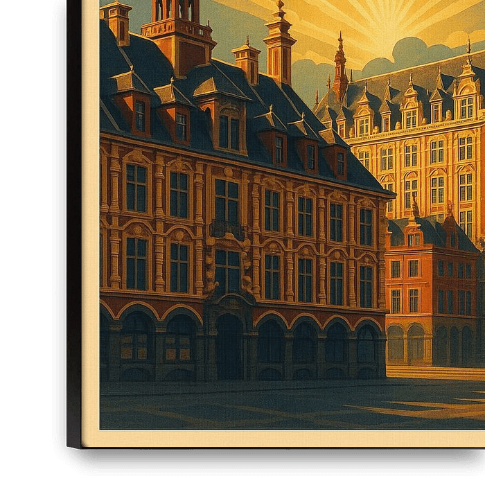 Achetez cette œuvre d'art de paysage Lille Art Deco Poster - Grand Place &amp ; Belfry in Vintage Style par Travel Shop sur toile, aluminium, ArtFrame ou photographie (encadrée), impression d'art en haute qualité et tout format.