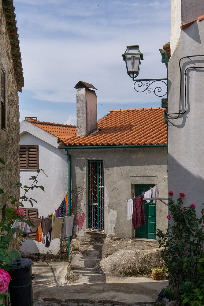Une rue de Linhares da Beira, des roses, du linge propre et un temps ensoleillé.