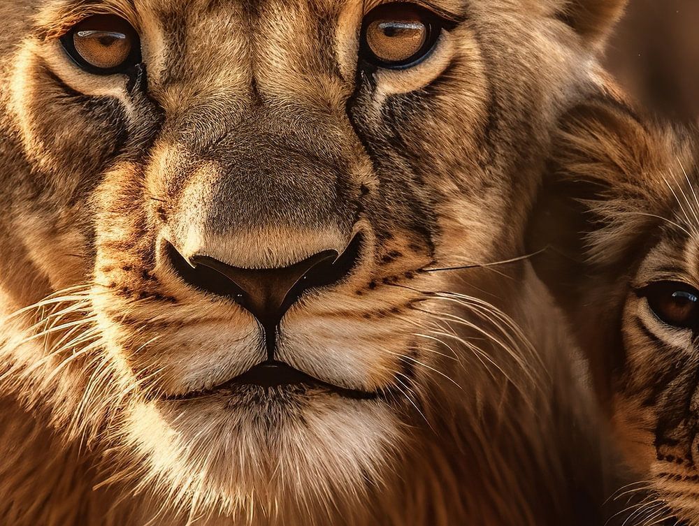 Dans cette impressionnante photographie en gros plan de la savane africaine, nous voyons une lionne près de son petit. La lionne respire la force et la dignité avec ses yeux perçants, alertes et attentifs. Sa fourrure, éclairée par les rayons du soleil, présente de subtiles nuances de jaune d'or et de brun clair...,