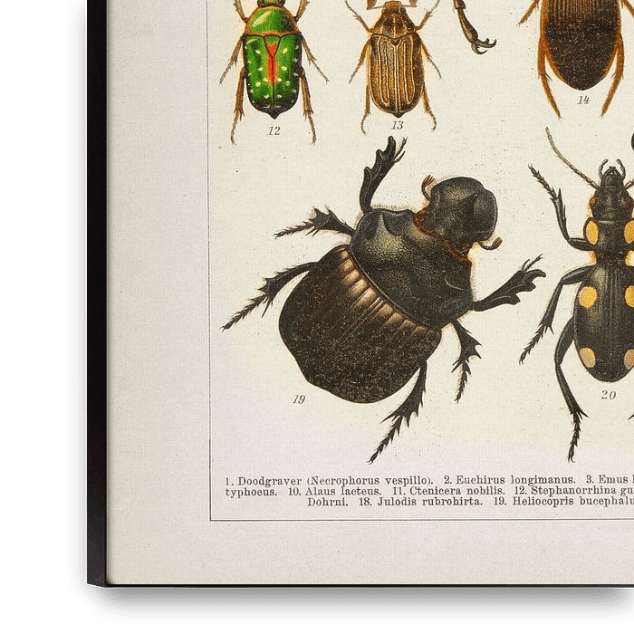 Une belle plaque extra-large présentant un certain nombre de coléoptères en couleur. Les noms latins sont indiqués sous la plaque. Il s'agit notamment du fossoyeur, du prédateur d'eau, du coléoptère goliath et du scarabée marcheur doré.