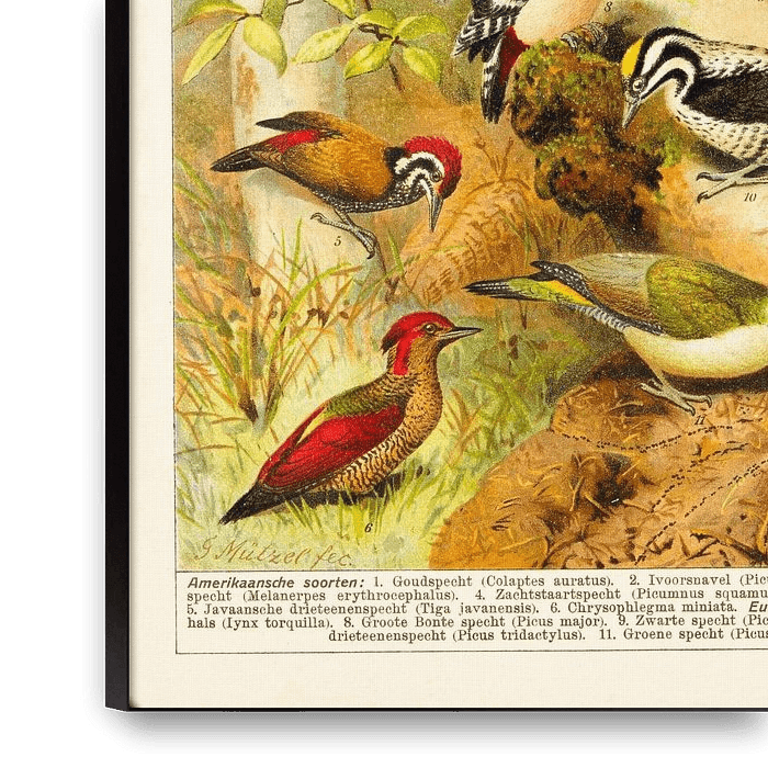 Belle planche en couleurs représentant 11 pics. Des pics américains, asiatiques et européens tels que le pic doré, le pic à tête rouge, le pic javanais, le pic épeiche, le pic épeichette, le pic noir et le pic vert.