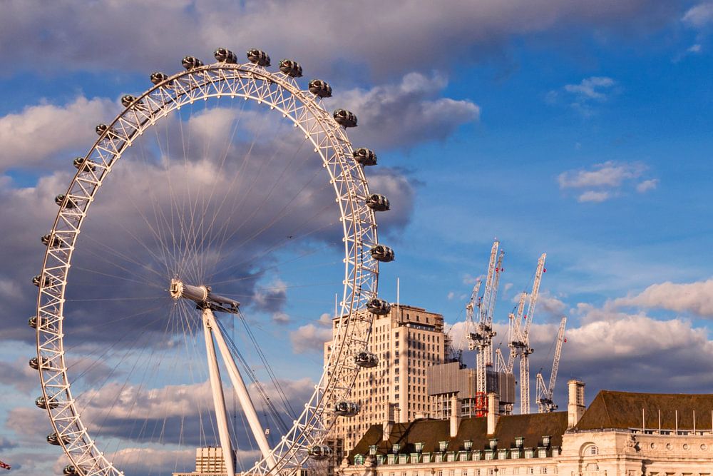 Das London Eye mit der Old Country Hall am anderen Themseufer, ganz links sieht man die Hungerford Bridge und Golden Jubilee Bridges in London in der Abendsonne