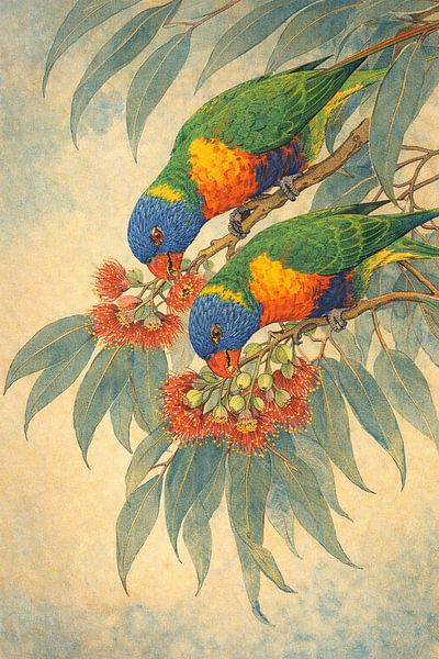 Cette illustration représente un couple de loris arc-en-ciel en train de grignoter le nectar d'un eucalyptus en fleur. La composition s'inspire de la gravure japonaise traditionnelle, avec un équilibre subtil entre détails et tranquillité. Les couleurs vives et les formes naturelles associent l'éclat des oiseaux à la simplicité raffinée…