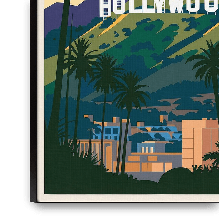Les palmiers gorgés de soleil et l'emblématique logo d'Hollywood créent un sentiment de splendeur et de glamour. Les couleurs douces du paysage transmettent une atmosphère à la fois relaxante et excitante. Idéale pour le salon, cette œuvre d'art apporte un peu d'atmosphère hollywoodienne dans votre pièce et invite à la rêverie.