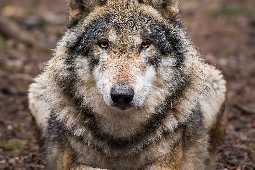 Un loup dans la forêt allemande regardant droit dans la caméra alors qu'il est couché sur le sol.