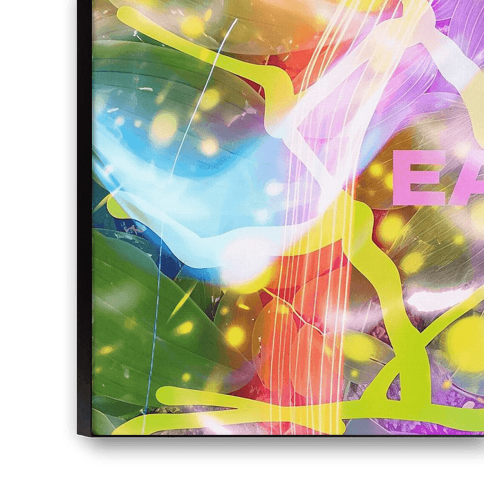 Des coups de pinceau jaune vif et vert lime serpentent de manière ludique à travers l'image, comme s'ils avaient été appliqués avec un pinceau ou une lumière. Ils rappellent des éclairs abstraits ou des vagues d'énergie.
