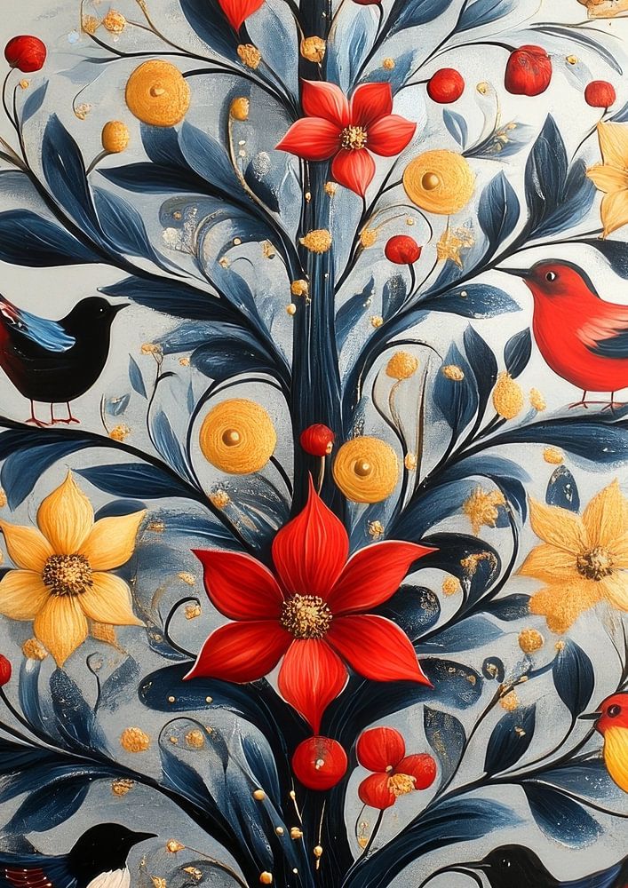 Un arbre de Noël orné de motifs floraux et de cœurs, répandant joie et chaleur.