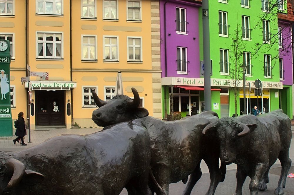 Lünen, la porte du Münsterland au nord de la Ruhr, photo prise à Im Hagen, la rue du marché prolongée de la rue commerçante de Lünen. Au premier plan, le monument aux marchands de bétail qui vendaient leur bétail à Lünen. En arrière-plan, l'horloge historique "Persiluhr" et l'hôtel "An der Persiluhr"