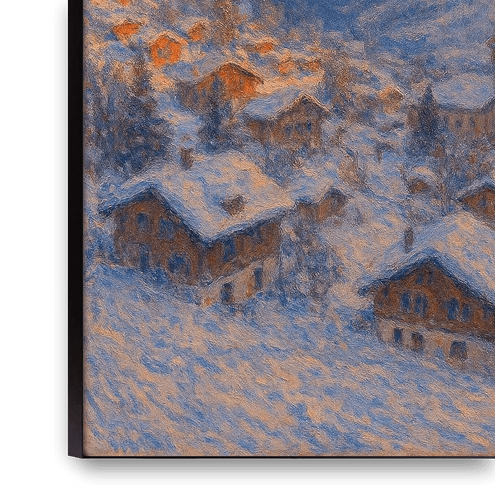 Cette œuvre capture la magie de "l'heure dorée" au cœur de l'hiver, ce moment fugace où le soleil, bien que bas, transforme le froid en chaleur. L'œil passe naturellement des lignes de crête enflammées aux bleus doux de la vallée, où une fine flèche d'église s'élève comme une note de calme au milieu de l'éclat. La composition respire l'harmonie : grandeur en haut, tendresse en bas.
