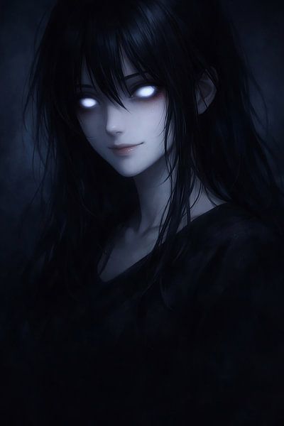 Portrait d'une jeune fille aux longs cheveux noirs et aux yeux blancs perçants et lumineux, d'une beauté envoûtante. L'éclairage doux et fantomatique sur le fond sombre évoque une atmosphère mystérieuse et surnaturelle, à la fois sereine et effrayante.