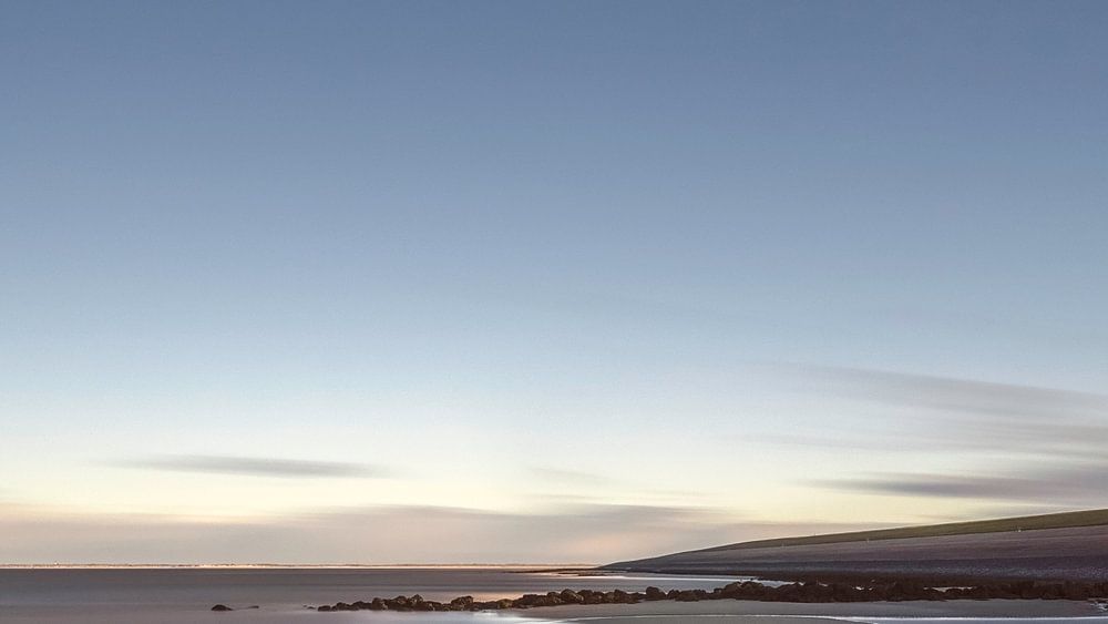 Une photo du Lange Jaap en utilisant une vitesse d'obturation longue. Cette photo a été prise à Huisduinen pendant la marée basse. À gauche, le Marsdiep et à droite, la digue de Den Helder.
