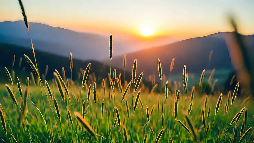 Cette photo présente une macro intime d'un brin d'herbe sauvage dans les montagnes au coucher du soleil, capturant un moment fugace de silence et de chaleur. Au premier plan se trouve un seul brin d'herbe, dont les fines structures capillaires et les minuscules gouttes de rosée sont clairement visibles, bien que la faible profondeur de champ transforme l'environnement en un bokeh doux. La chaude lumière du soir du soleil couchant dépose une lueur dorée sur l'herbe et crée des reflets délicats le long des bords, tandis que les ombres sont longues et douces sur les brins. Le filtre vintage confère à l'image une ambiance nostalgique : les couleurs sont légèrement désaturées, les contrastes sont atténués et un subtil effet de grain cinématographique se pose sur la scène comme un souvenir. En arrière-plan, les silhouettes des montagnes ne se dessinent que vaguement, dans des tons orangés pastel et des violets délavés, qui se fondent sans transition dans le ciel. La composition se concentre sur la texture et la lumière ; chaque brin d'herbe ressemble presque à un dessin au pinceau, tandis que le flou confère à l'image de la profondeur et une intimité presque onirique. On ressent l'immensité du paysage de montagne sans qu'elle ne domine le regard - au lieu de cela, l'image attire l'attention sur ce qui est petit, fragile et pourtant permanent dans la nature. Dans l'ensemble, la scène transmet une sérénité tranquille, estivale, un mélange de mélancolie et de beauté paisible qui invite le spectateur à s'attarder et à reprendre son souffle.