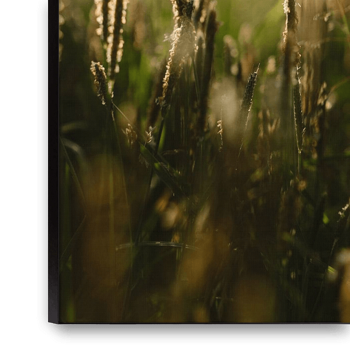 Cette œuvre vous permet de voir le monde du point de vue d'un mulot ou d'un enfant allongé dans l'herbe : bas, intime et plein de petits détails qui vous échappent normalement. Les touffes d'herbe captent la lumière chaude du soir et brillent d'un or doux sur les bords. Un chaume occupe subtilement le devant de la scène, délicatement…