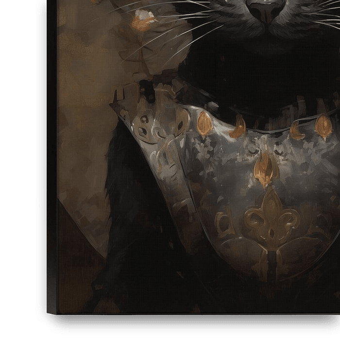 Dans "Luna Florens", un gracieux chat noir est présenté sur fond de pleine lune. Le chat, aux yeux d'un jaune intense, porte une somptueuse couronne florale et une armure magnifiquement décorée. Les décorations dorées de l'armure et de la couronne florale résonnent avec l'éclat de la lune, créant un sentiment d'harmonie et d'exaltation.