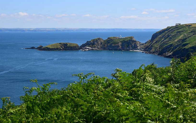 La péninsule avec le phare sud de Lundy et le débarcadère sur l'île de Lundy dans le canal de Bristol, au sud de l'Angleterre, avec la côte du Devon à l'horizon.