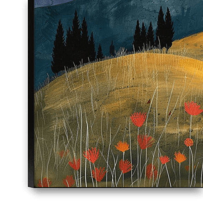 Une peinture minimaliste esquisse une scène de paysage avec un décor vallonné dans un style expressif, la lune étant subtilement visible à l'horizon.