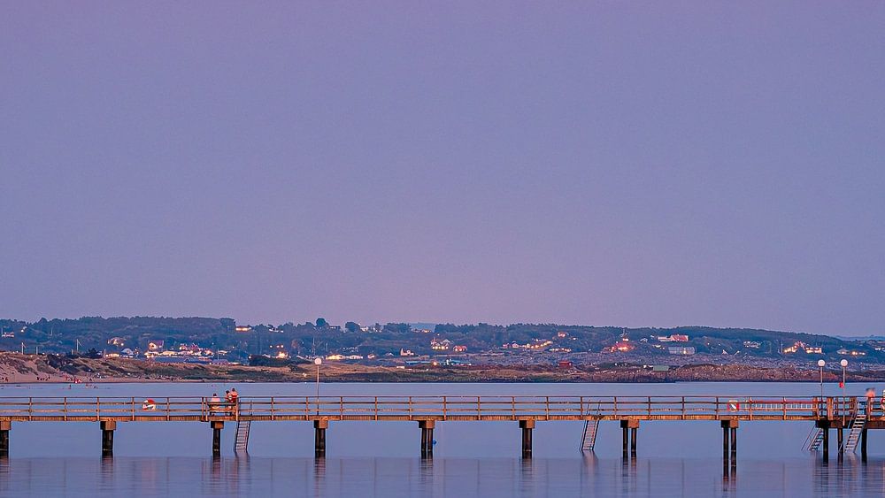 Photo 16:9 d'une soirée d'été sur la jetée de Falkenberg, en Suède, lors d'une éclipse lunaire totale, également connue sous le nom de lune de sang. Cela signifie que la Terre se trouve exactement entre le soleil et la lune, ce qui fait que la planète projette une ombre sur la lune.
