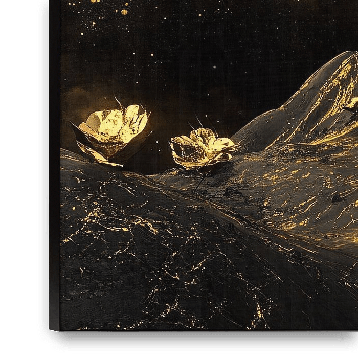 Ce magnifique motif associe la mystique d'une grande lune dorée à un paysage de montagne surréaliste rempli de fleurs épanouies. Les montagnes sont subtilement illuminées par des accents dorés, ce qui donne à l'ensemble une impression de rêve et de luxe. Cette œuvre d'art, avec ses couleurs vibrantes d'or et de noir, dégage un sentiment…