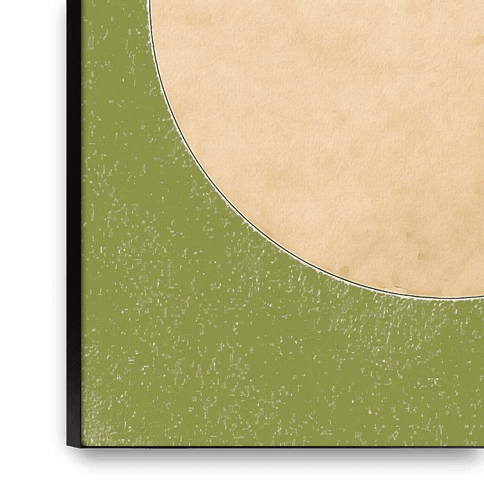 Une représentation abstraite et minimaliste de la pleine lune, baignée d'une douce lumière, dans des tons beiges neutres sur fond vert.