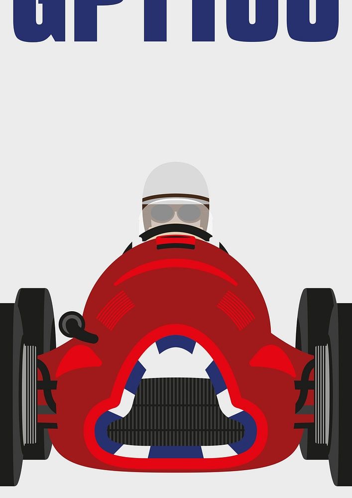 Un graphique stylisé de la voiture de Formule 1 Alfa Romeo GPT158 de Giuseppe Farina domine le premier plan sur un fond rouge et gris saisissant. Le design de la voiture de F1 est attribué à Gioachino Colombo, 1950, et est présenté dans un style minimaliste avec des couleurs vives et des lignes épurées.