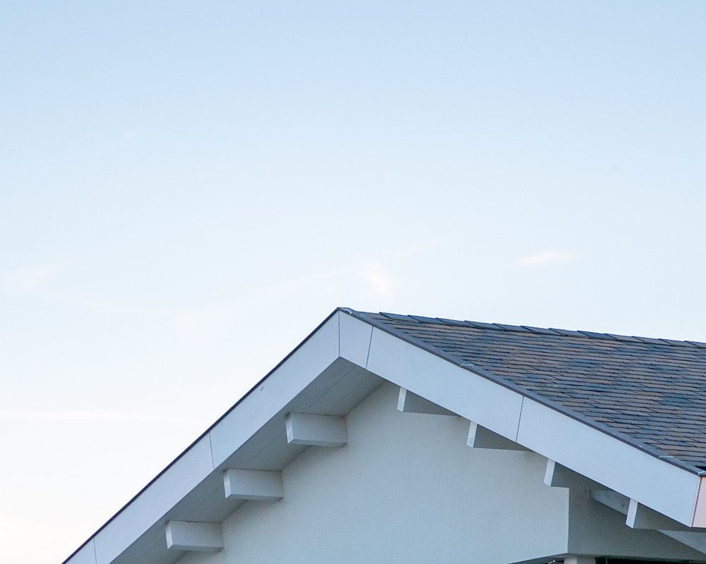 Tegen het vallen van de avond is de maan al te zien. Deze staat mooi afgebeeld boven een huis waarin de weerspiegeling van de ondergaande zon te zien is.