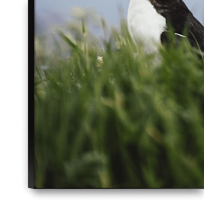 Macareux moine (Puffin) dans l'herbe, avec un ciel bleu, au milieu d'une nature intacte en Écosse. Photographié sur l'île inhabitée de Staffa, près de l'île de Mull, sur une falaise.