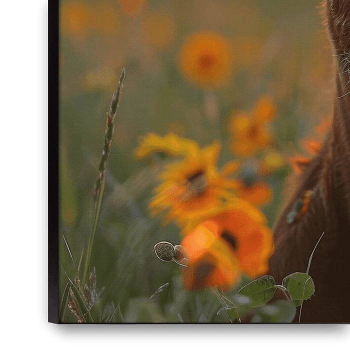 Cette image impressionnante fait le portrait d'une vache qui regarde doucement l'appareil photo dans la dernière lumière d'un coucher de soleil spectaculaire. La lueur dorée du ciel et le jaune vif des tournesols qui lui servent de couronne créent une atmosphère de chaleur et de paix. La composition capture l'aura tranquille du moment…