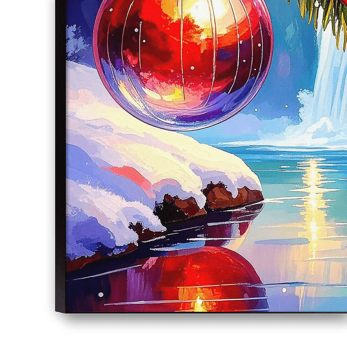 Ici et là, on voit des flocons de neige tomber doucement, touchant délicatement la scène et rendant l'atmosphère hivernale encore plus sensuelle et calme. La composition s'équilibre entre précision des détails et profondeur de l'atmosphère : chaque souffle de flocon de neige sur les branches, l'incandescence du soleil à l'horizon et les doux reflets de lumière dans l'eau contribuent à l'ambiance poétique. L'œuvre invite à se plonger dans l'instant où la nature et la symbolique festive fusionnent et transmet un recueillement silencieux qui fait ressentir à la fois le froid hivernal et la chaleur de Noël.