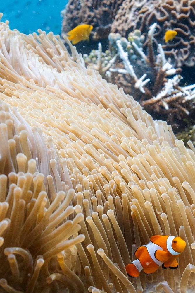 Le magnifique poisson anémone, également connu sous le nom de Nemo, se déplace parmi les anémones. Le corail cérébral est visible à l'arrière-plan, ainsi que les magnifiques eaux bleues des Raja Ampat, en Indonésie.