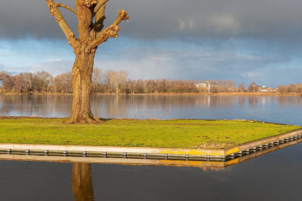 Le Weegje, en Hollande méridionale, est un lac agréable à parcourir. D'un côté le soleil et de l'autre un ciel sombre donne cette photo spéciale avec un arbre avec un reflet et même un morceau d'arc-en-ciel.