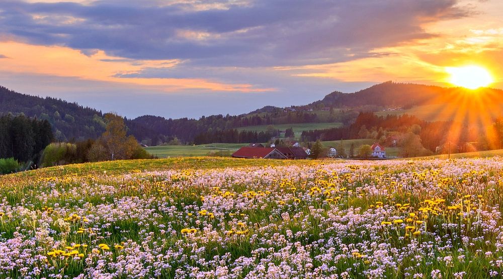 Coucher de soleil pittoresque avec des fleurs écloses au printemps. Allgäu, Bavière, Allemagne, Europe