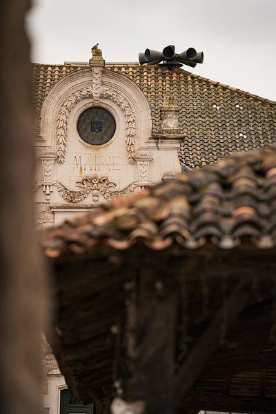 Ce gros plan capture un détail de la mairie, l’hôtel de ville français, en mettant l’accent sur l’architecture et l’atmosphère. L’image se concentre sur un coin du bâtiment, une fenêtre, un ornement de façade ou une inscription, révélant les textures de la pierre, du bois et de la peinture dans des couleurs riches. Les ombres douces et les reflets de lumière captent le moment de la journée, donnant à ce bâtiment historique une présence vivante, presque tangible. En se focalisant sur un petit fragment, le cliché offre un portrait intime d’un lieu généralement perçu comme formel et distant. Les couleurs — tons chauds et terreux, légères touches de bois et de pierre, peut-être le bleu du ciel ou le vert des plantes environnantes — renforcent le sentiment de proximité et de présence humaine, comme si le bâtiment respirait et était témoin de la vie quotidienne de la commune. Le détail met en valeur à la fois le patrimoine et le rôle de la mairie en tant que centre social et administratif. Il invite le spectateur à s’arrêter pour admirer la beauté des petits éléments architecturaux et le rythme silencieux et constant de la communauté et de la tradition que ce bâtiment symbolise