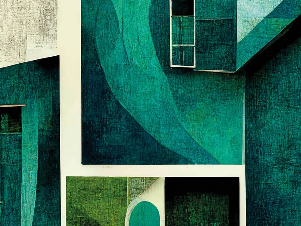 Cette peinture abstraite représente une maison moderne et minimaliste. Avec un mélange vibrant de nuances de vert et de bleu aqua, il évoque le contraste marqué entre la nature et la civilisation. C'est une pièce idéale pour les personnes qui aiment le minimalisme et qui convient particulièrement à la décoration des salons et des salles à manger.