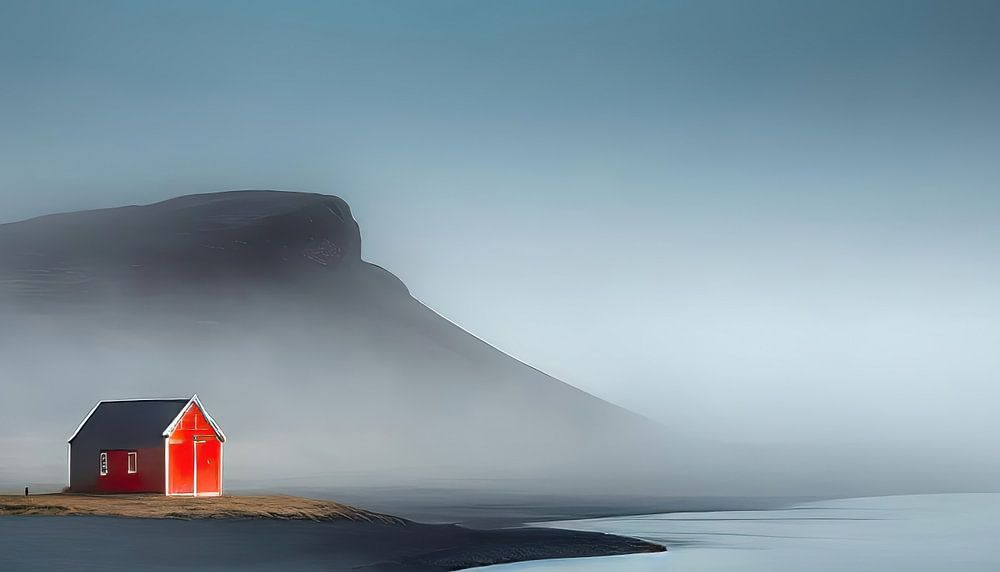 Une maison rouge isolée se dresse près de la côte sur un fond de collines couvertes de brume, créant une atmosphère calme et mystérieuse. L'eau et le premier plan sombre contrastent et renforcent la sérénité de la scène.....L'image Digitalart a été conçue par mes soins, grâce au composing, à l'IA générative et à la retouche.