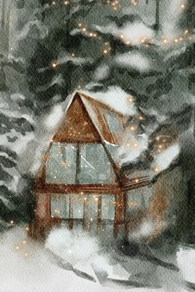 Maison enchantée dans une forêt hivernale pleine d'ambiance avec des "lucioles" lumineuses.