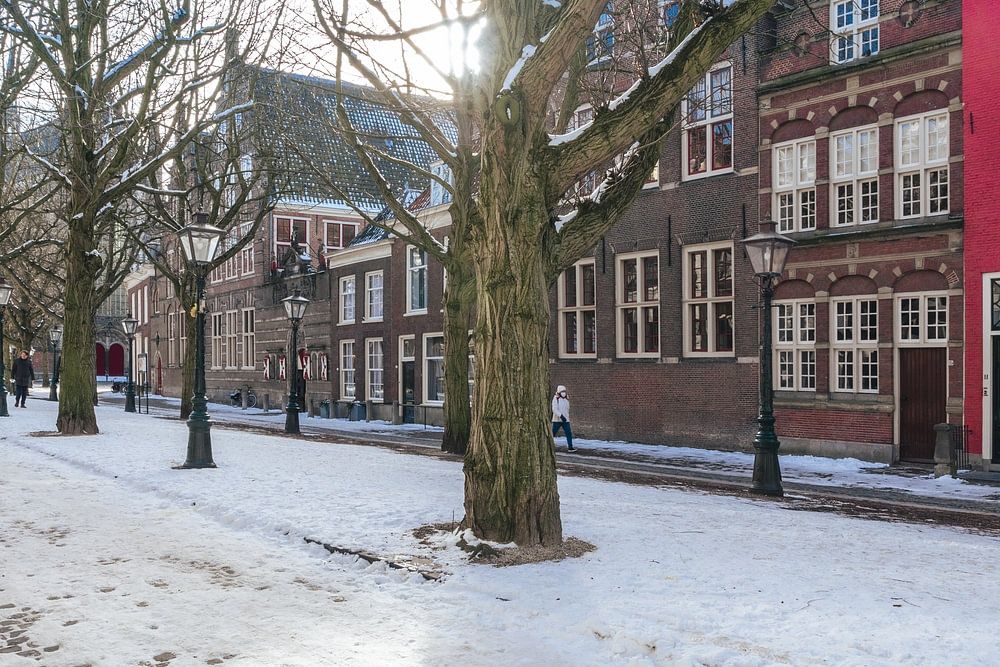 La Hooglandse Kerkgracht à Leyde avec une petite couverture blanche. Avec la belle maison rouge.