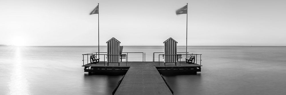 Maisons de bain sur la mer Baltique au coucher du soleil en noir et blanc par Manfred Voss, Photographie Noir et Blanc