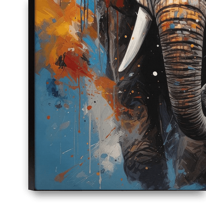 Chromatic Majesty&quot ; est une explosion de couleurs et de vitalité, avec un éléphant qui se dresse majestueusement sur un fond d'abstraction colorée. Les teintes chaudes d'or et d'orange forment un contraste saisissant avec les éclaboussures froides de bleu et de blanc, créant un festin visuel qui met en évidence la puissance et…