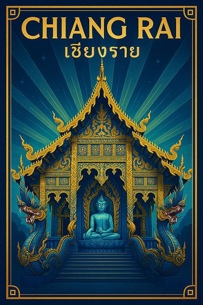 Chaque courbe, sculpture et élément ornemental est méticuleusement illustré, mettant en valeur la fusion audacieuse de l'architecture traditionnelle du Lanna et de l'interprétation artistique moderne. La présence des sinueux serpents gardiens bleus flanquant les marches du temple ajoute un élément de puissance et de protection, attirant le regard du spectateur vers la figure sereine du Bouddha assis à l'entrée. Cette figure centrale ancre l'œuvre, renforçant un sentiment de paix, de clarté spirituelle et d'équilibre.
