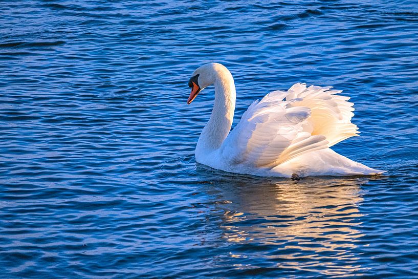 Un cygne majestueux glisse tranquillement sur les douces vagues du lac de barrage du Danube dans le Bade-Wurtemberg. La lumière chaude du soleil bas fait briller son plumage blanc comme de l'ivoire doré. Un moment de paix et d'élégance parfaite au cœur d'une nature intacte.