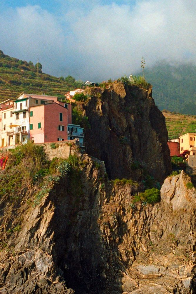 Les cinq villages de "Cinque Terre", en Italie, sont connus pour leurs chalets colorés situés sur des pentes rocheuses. Cette photo montre la falaise de Manarola. La superposition des rochers et des montagnes avec les jeux d'ombre et de lumière continue de me fasciner. La photo analogique donne une impression chaleureuse et vintage.