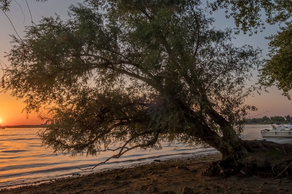 Le faible niveau de l'eau a permis de photographier le magnifique coucher de soleil sous ce vieil arbre aux vieilles racines.