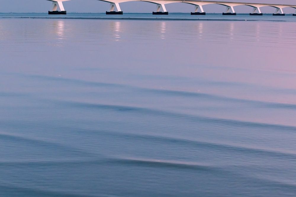 Une matinée agréable et calme au pont Zeeland, aux Pays-Bas. Cette photographie a été prise à un moment unique alors que la marée et le soleil se levaient ensemble. Le soleil, derrière moi, mettait en valeur le pont et apportait une belle lueur rose. La marée montante créait les petites vagues dans l'eau. Les vagues et le pont créent des lignes de tête absorbantes.