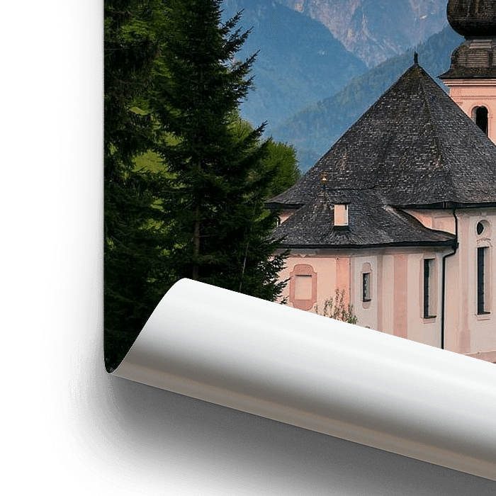 Lever du soleil à la célèbre église de pèlerinage Maria Gern près de Berchtesgaden, dans le sud de l'Allemagne, avec vue sur la montagne Watzmann dans le pays de Berchtesgaderner, en Bavière, Allemagne du Sud.