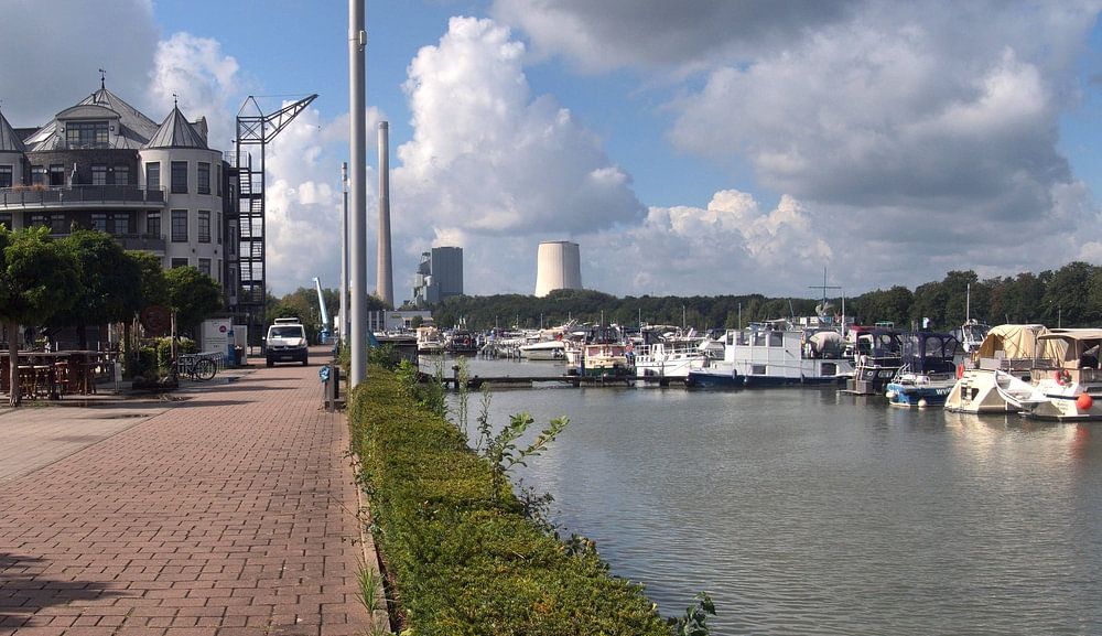 Vue panoramique sur l'un des plus grands ports de plaisance de Rhénanie-du-Nord-Westphalie, la marina de Rünthe, sur le canal Dortmund-Ems. En arrière-plan, la centrale électrique de Bergkamen.