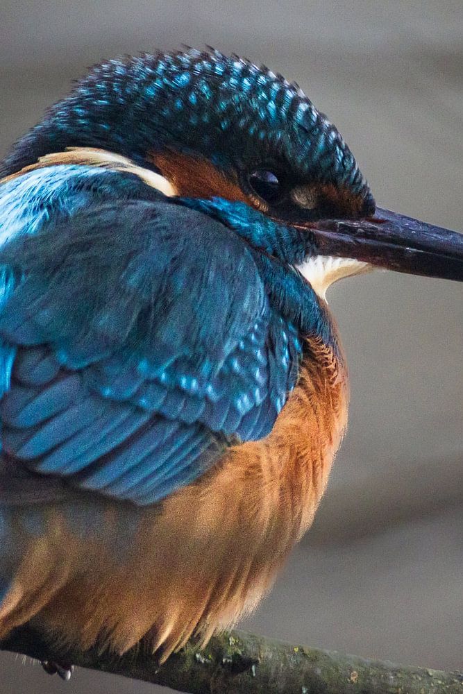 Martin-pêcheur mâle photographié de très près au 500 mm F4 canon. Photo d'hiver avec des tons de gris et marron et des branches nues.