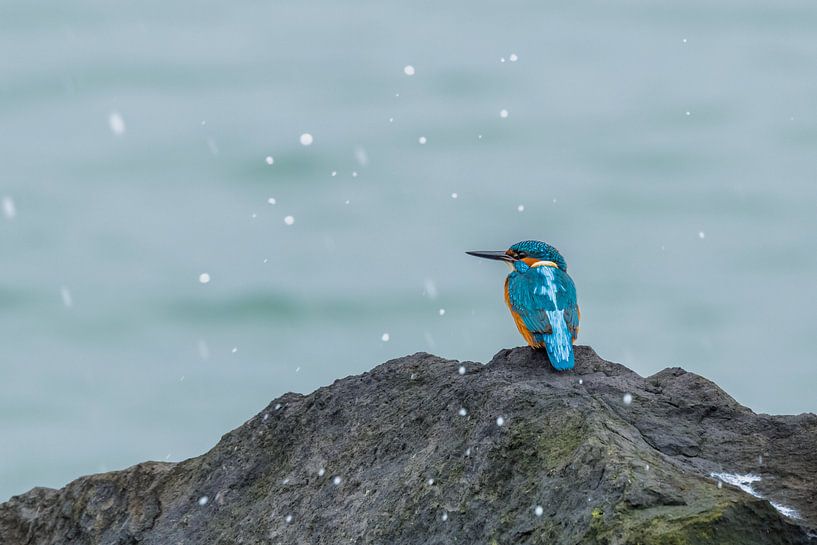 Mes yeux scrutent les pierres le long du bord du Brouwersdam. Y a-t-il des oiseaux ? Soudain, j'aperçois quelque chose de bleu. À ma grande surprise, il s'agit d'un martin-pêcheur. C'est génial ! L'animal me tourne le dos. L'eau frappe les pierres sous l'effet du vent et des vagues et éclabousse tout autour. Le martin-pêcheur reste…