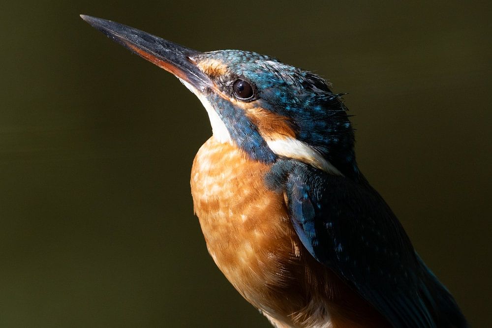 Sa poitrine orange vif et son dos bleu profond se détachent brillamment sur l'arrière-plan mystérieux. L'oiseau semble ainsi briller encore plus intensément, comme s'il apportait la lumière dans l'immobilité de son environnement. L'atmosphère est calme et concentrée, comme si le temps s'était arrêté un instant.